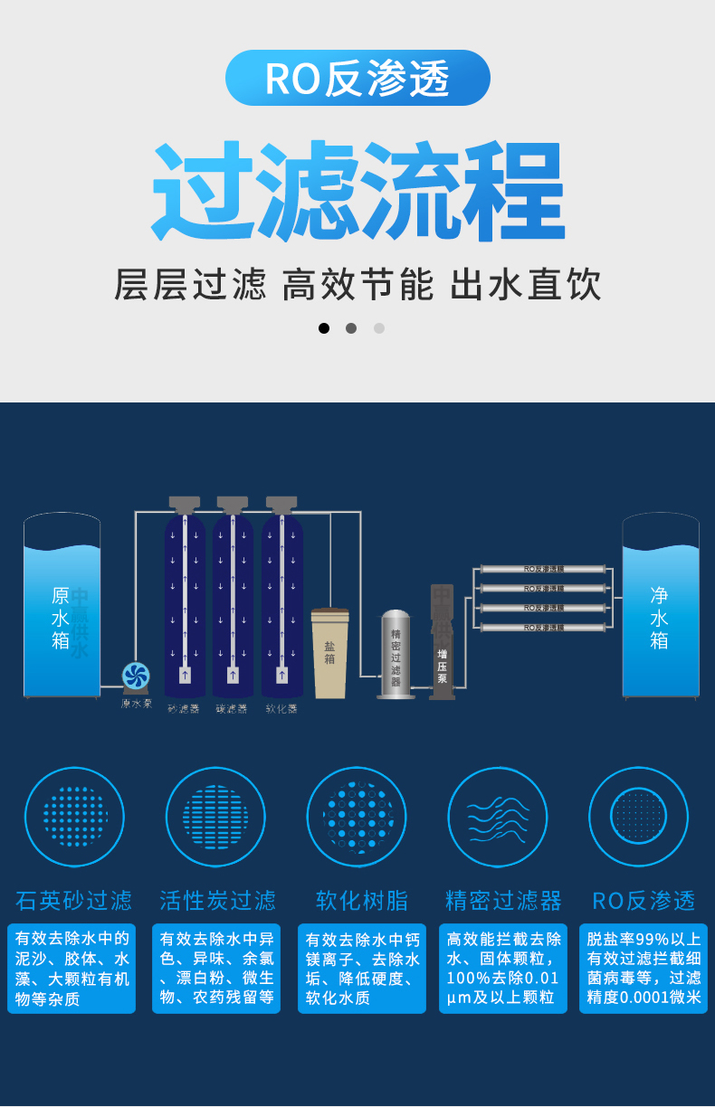 原水 → 原水箱 → 原水泵 →多介質過濾器 (石英砂過濾器)→活性炭過濾器 →軟水處理器(添加阻垢劑裝置) → 精密過濾器 → 高壓泵 → 一級反滲透(RO)裝置 →紫外線殺菌裝置(臭氧殺菌裝置) → 用水點